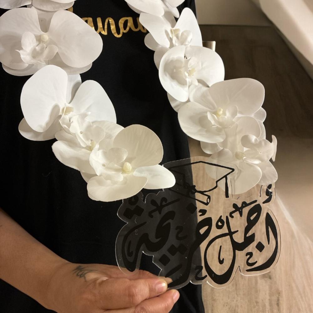 - اسم المنتج: عقد تخرج ورد صناعي عبارة "أجمل خريجة"