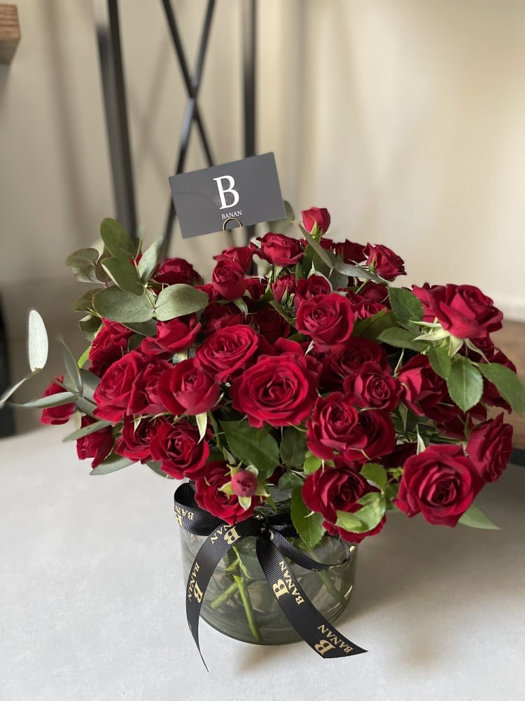 - التصميم: فازة زجاجية شفافة مزينة بورود جوري حمراء.