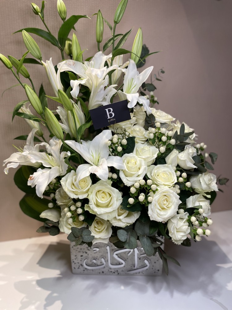 تتألق فازة كبيرة ورد طبيعي بجمالها ونعومتها من متجر هدايا بنان، لتكون الخيار المثالي لإضاءة أي مكان بالانتعاش والأناقة، مع الزهور البيضاء المختلفة، تضيف هذه الفازة لمسة من الهدوء والفخامة إلى محيطك، حيث ان الفازة مصممة بشكل جميل لتحافظ على تنسيق الزهور ببراعة، مما يجعلها إضافًة رائعة لأي مناسبة