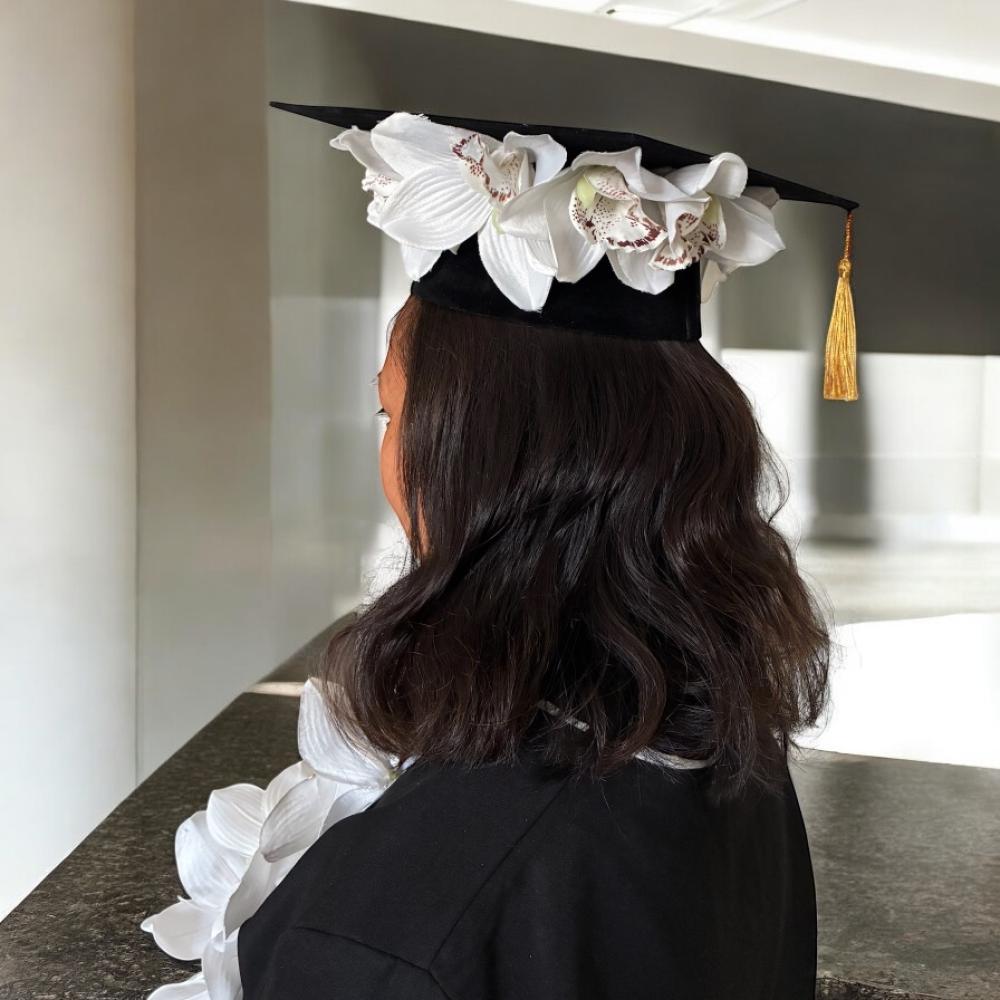 - تصميم أنيق يجمع بين الفخامة والبساطة، مع لمسة من الورد الصناعي لتضفي جمالاً على إطلالة التخرج المميزة.
